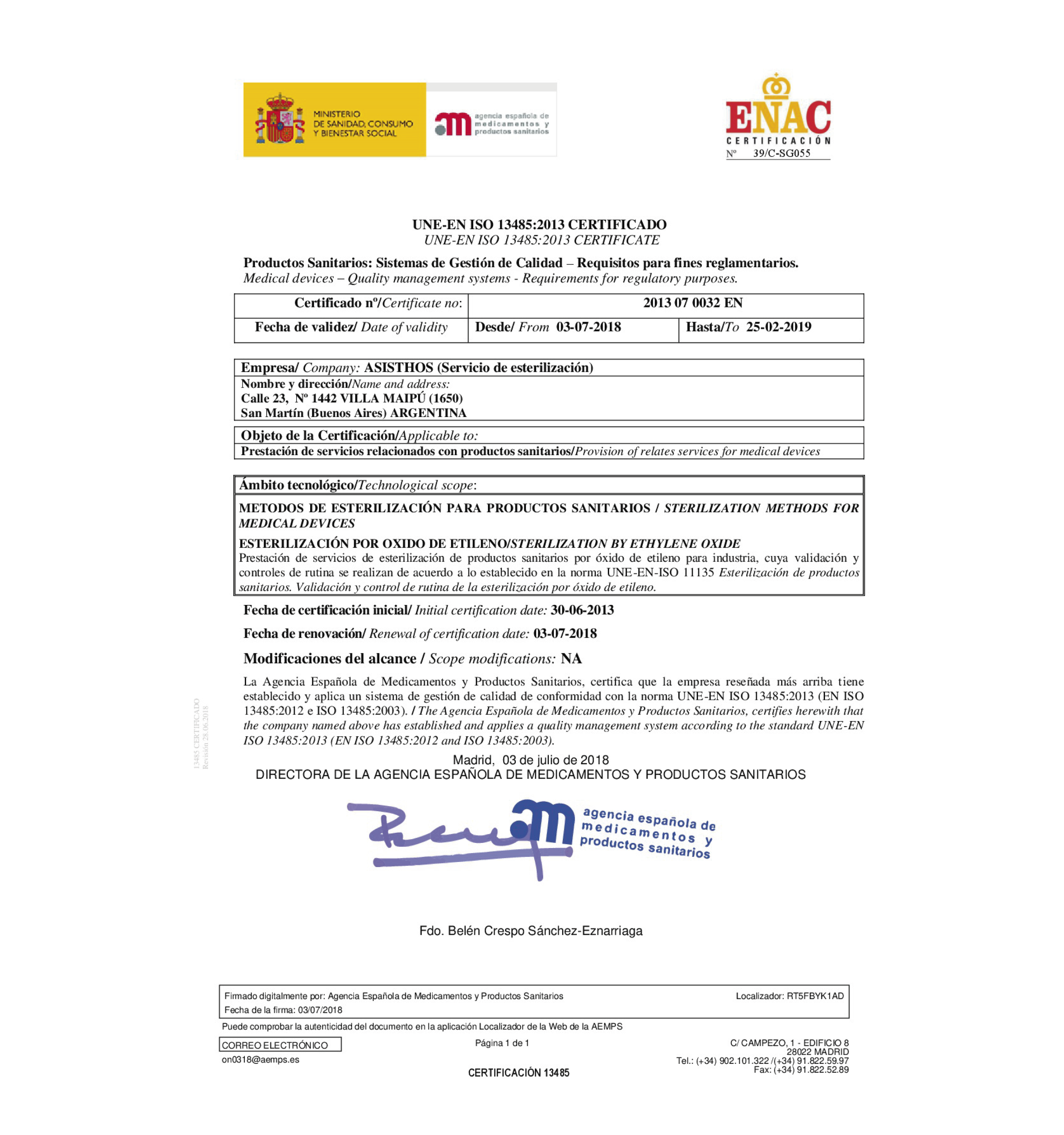 En ese sentido, en 1998 Asisthos SRL realizó su primera certificación de la Norma pionera en este sentido, ISO 46002:1996 (Sistemas de la calidad. Productos sanitarios. Requisitos particulares para la aplicación de la Norma EN ISO 9002) a través del Organismo Notificado 0318, la Agencia Española de Medicamentos y Productos Sanitarios. A partir de ese momento y en pos del objetivo de mejora constante logramos años tras año superar con creces las duras exigencias de las inspecciones del Organismo Notificado para, en forma continuada, recertificar las sucesivas revisiones y actualizaciones de la norma, siendo Asisthos SRL la única Empresa que brinda esterilización para terceros en Argentina, cumpliendo y certificando este reconocido estándar internacional.